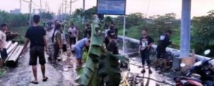 Selain pohon pisang, tampak sejumlah batang tebu, dan papan proyek Pembangunan SKTT ikut menutup jalan tersebut. Hujan rintik-rintik tak menurunkan semangat anak-anak muda Barengkrajan mengatur jalan roda dua yang memaksa lewat.