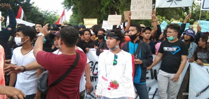 Ratusan para buruh dan seluruh mahasiswa masyarakat tergabung menjadi satu gelar aksi demo menolak pengesehan Omnibus Law RUU Cipta di sahkan menjadi Undang-Undang oleh Dewan Perwakilan Rakyat Republik Indonesia (DPR RI) bersama Pemerintah Pusat dalam sidang paripurna