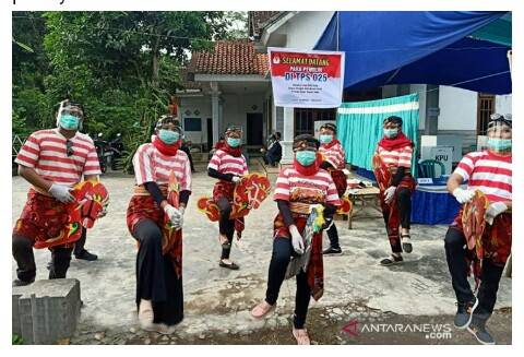 JEMBER – Petugas KPPS di TPS 25 Desa Tamansari, Kecamatan Wuluhan Kabupaten Jember melakukan atraksi kuda lumping sebelum dilaksanakan pemungutan suara, Rabu (09/12/2020).