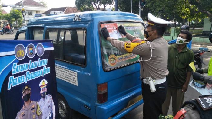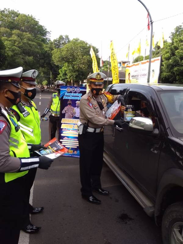 Dalam Operasi Lilin Semeru tahun ini, Kasat Lantas Polres Pasuruan membagikan masker dan pemasangan sticker ajakan AYO PAKAI MASKER di Jl Pahlawan Kota Pasuruan.