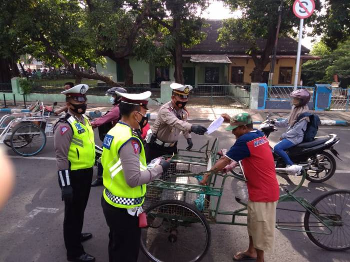 Kasat lantas Polres Pasuruan Kota AKP Yudiono, S.H beserta anggota memberikan sosialisasi bagi pengedara R4 & R2 serta pengguna jalan, termasuk tukang becak untuk tetap melaksanakan protokol kesehatan guna mencegah dan memutus penyebaran covid 19.