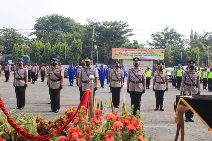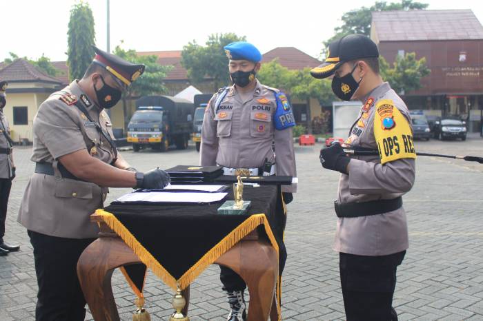 PASURUAN – Kapolres Pasuruan AKBP Rofiq Ripto Himawan memimpin acara serah terima jabatan (sertijab), di halaman lapangan Mapolres Pasuruan, Selasa (16/3).
