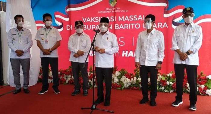“Dalam kesempatan ini pula,saya meninjau pelaksanaan vaksinasi massal di Kabupaten Barito Utara.Vaksinasi ini dilakukan untuk mengejar head imunitas seluruh masyarakat,yang kita harapkan mencapai 70 persen dari jumlah penduduk 181,05 juta jiwa,”kata KH.Ma’ruf Amin.