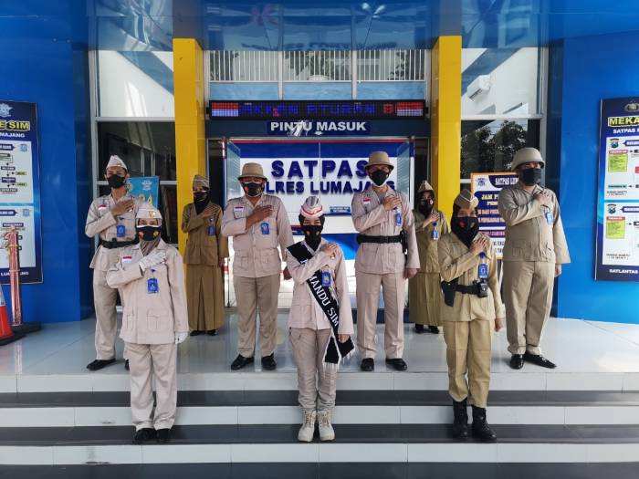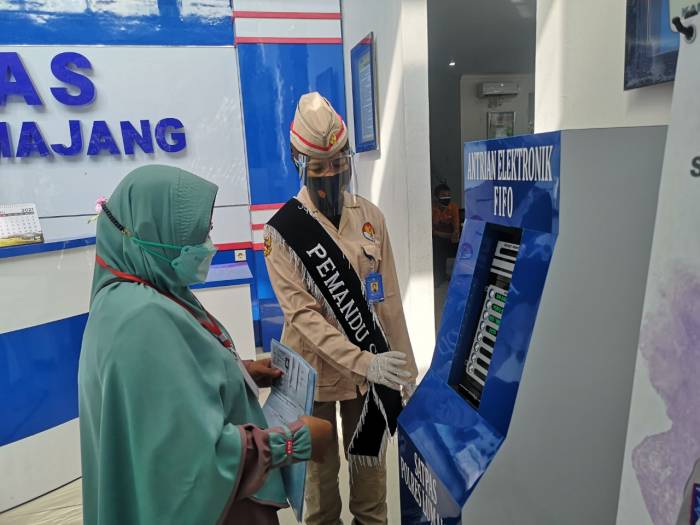 Dengan gaya nyentrik, petugas terlihat semangat memberikan pelayanan kepada pemohon SIM. Dalam Pelayanan SIM di Satpas Polres Lumajang menerapkan protokol kesehatan.