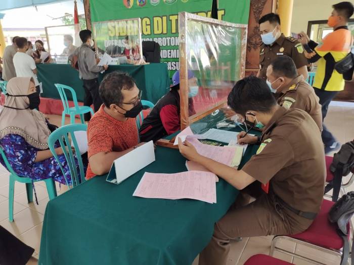 PASURUAN – Warga Pasuruan menjalani sidang tindak pidana ringan (Tipiring) di Posko Satuan Tugas (Satgas) Penanganan Covid-19 Kab. Pasuruan, Kamis(15/07/2021) Siang. Sidang yang berlangsung dari jam 09.30 hingga Siang hari itu dipimpin hakim tunggal Abang Marthen Bunga, S.H., Mum dengan Panitera Ahmed Taufik, SH dan JPU Joni Dan Darwis