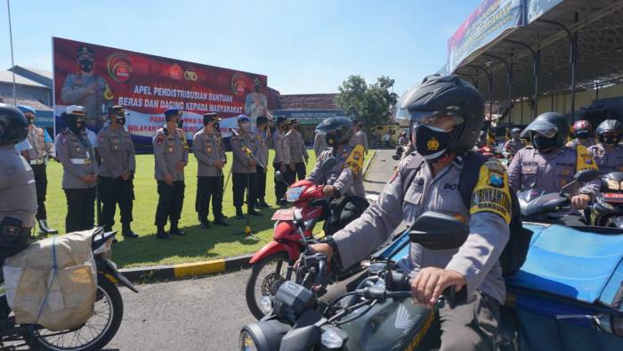 Apel pendistribusian Bansos sembako dan daging qurban dipimpin Kapolresta Mojokerto AKBP Rofiq Ripto Himawan S.I.K S.H., M.H yang diikuti para Pejabat Utama dan semua Bhabinkamtibmas dari Polsek jajaran Polresta Mojokerto.