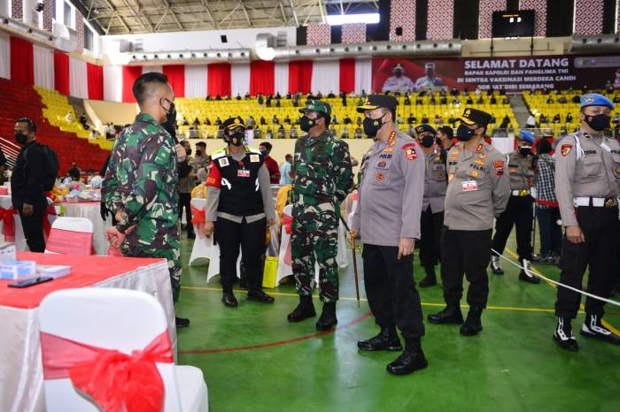 JAKARTA – Panglima TNI Marsekal Hadi Tjahjanto bersama Kapolri Jenderal Listyo Sigit Prabowo meninjau pelaksanaan Vaksinasi Merdeka Candi di Semarang, Jawa Tengah, Kamis, (5/8/2021). Kegiatan ini salah satu upaya akselerasi vaksinasi sebagai hadiah di hari Kemerdekaan Republik Indonesia (RI) ke-76.