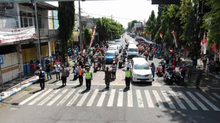 LUMAJANG – Ratusan pengendara yang melintas di empat titik di wilayah persimpangan Adipura, Klojen, ST dan simpang Toga Lumajang, dihentikan petugas Satlantas Polres Lumajang, dalam upaya mengajak masyarakat menghormati detik detik proklamasi, Selasa (17/8/2021).