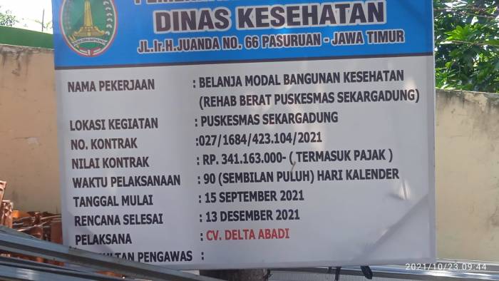 PASURUAN – Proyek pembangunan rehabilitasi berkategori berat di Puskesmas Sekargadung Kecamatan Purworejo Kota Pasuruan dituding kurang profesional. Sebab, dalam pengerjaannya dianggap mengabaikan kesehatan dan keselamatan kerja (K3) serta protokol kesehatan.