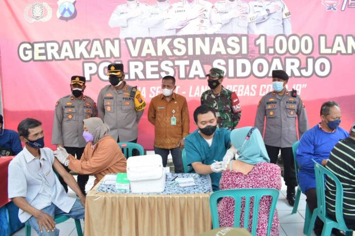 SIDOARJO – Upaya percepatan vaksinasi Covid-19 bagi orang lanjut usia (lansia) di wilayah Kabupaten Sidoarjo, terus dimasifkan Polresta Sidoarjo. Karena capaian vaksinasi bagi lansia di Sidoarjo masih 58 persen.