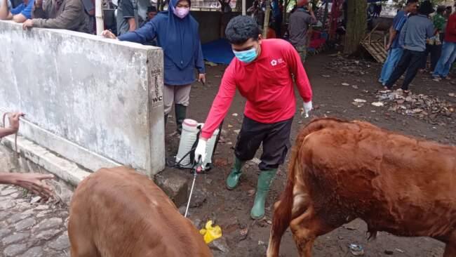JEMBER – Relawan PMI Kabupaten Jember kembali turun ke masyarakat melakukan penyemprotan cairan disinfektan. Namun, kali ini tujuannya bukan pencegahan penularan COVID-19 saja tetapi juga melakukan pencegahan penularan Penyakit Mulut dan Kuku (PMK) pada hewan.