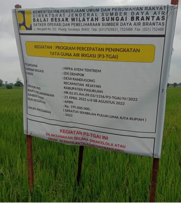Seperti yang terjadi pada salah satu pekerjaan yakni Proyek Program percepatan peningkatan tata guna air irigasi ( P3- TGAI ) yang didanai melalui APBN yang terletak di Kabupaten Pasuruan Tahun 2022.