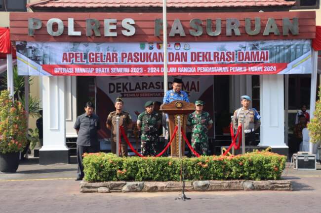 PASURUAN – Kapolres Pasuruan AKBP Erick Frendriz, S.I.K., M.Si., bersama Wakil Bupati Pasuruan, Kasdim 0819 Pasuruan, Kajari Pasuruan, Personil TNI Kodim 0819, dan Seluruh personil Polres Pasuruan mengikuti Upacara Peringatan Hari Bhayangkara Ke-76 secara Virtual di Lapangan Sarja Arya Racana Polres Pasuruan, Selasa (05/07/2022).