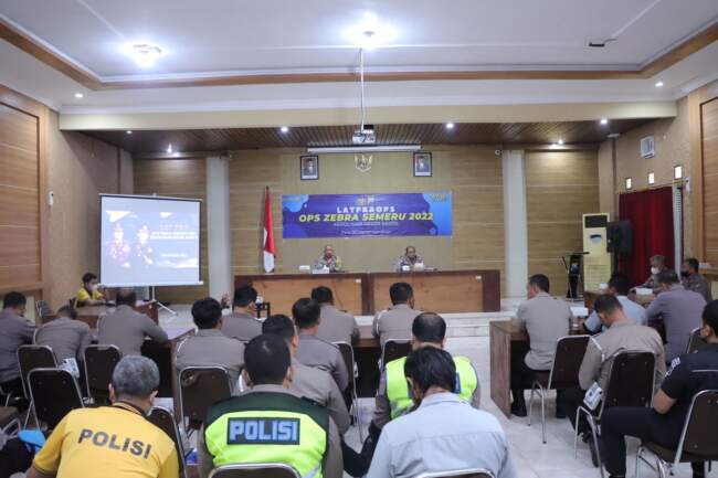 KEDIRI – Menjelang pelaksanaan Operasi Zebra Semeru 2022 yang akang h dilaksanakan serentak di seluruh Indonesia selama 14 hari mulai tanggal 03 Oktober sampai dengan 16 Oktober, Polres Kediri menggelar Latpraops di Aula Jana Nuraga Mapolres Kediri, Jum’at (30/9/22).