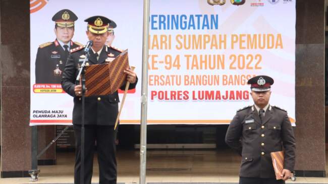 Lumajang – Kapolres Lumajang AKBP Dewa Putu Eka D, S.I.K M.H memimpin upacara peringatan Hari Sumpah Pemuda di halaman Mapolres Lumajang, Jum’at (28/10/2022) pagi.