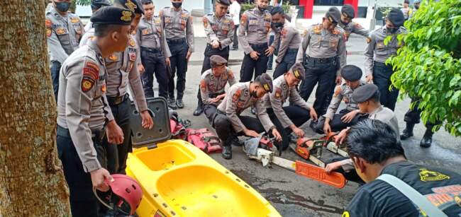 Untuk itu, Satlantas Polres Ponorogo mempersiapkan berbagai peralatan. Mulai dari gergaji mesin, cangkul, sekop, jas hujan untuk anggota, dan peralatan dapur umum.