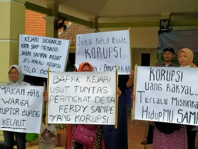 Setelah pengisian blangko formulir tampak dihalaman warga korban pemotongan menyampaikan keluhanannya lewat poster bertuliskan Kejari. Usut tuntas perangkat korupsi BLT-DD, PKH dan BPNT, ada juga yang bertuliskan Pecat dan Hukum Ferdy Sampe, Beri keadilan pada kami disela-sela pada saat menyampaikan aspirasi, sebut saja Mbak Cantik bukan nama aslinya menyampaikan kalau ada yang mendapatkan satu kali dan sampai tahun 2022 tidak pernah mendapatkan bantuan.