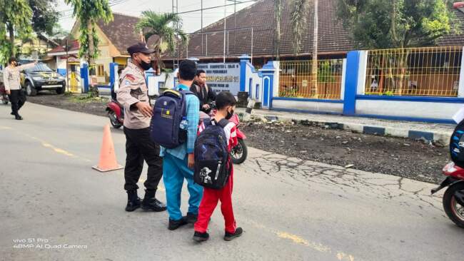 Lumajang -Saat masuk sekolah pagi hari, Polsek Pasirian Polres Lumajang menempatkan personelnya di depan sekolah SDN 1 Pasirian untuk menyeberangkan para pelajar yang akan masuk sekolah.