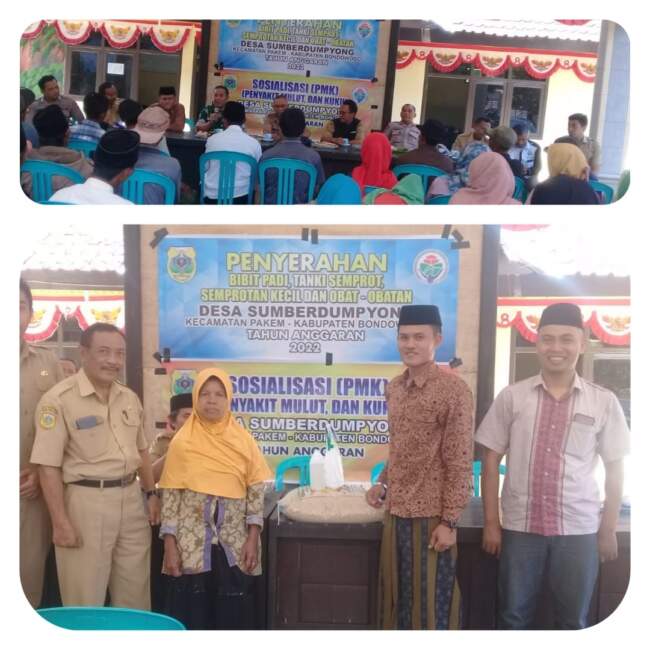BONDOWOSO – Dalam kegiatan sosialisasi penyakit kuku dan mulut (PMK) serta mendukung program peningkatan produksi pertanian tanaman pangan, Pemerintah Desa Sumberdumpyong Kecamatan Pakem menyerahkan bantuan berupa bibit padi inpari ss 32, semprotan kecil dan obat disinfektan kepada 200 penerima manfaat, bertempat di pendopo Balai Desa Sumberdumpyong selasa,(20/12/2022).