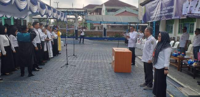 BARITO UTARA- Acara penyerahan SK. Tenaga Kasehatan, diawali dengan pengabilan supah dan janji jabatan fungsional kesehatan, di linngkup Pemerintah Kabupaten Barito Utara. Bupati Barito Utara, H. Nadalsyah melalui Wakil Bupati, Sugianto Panala Putra, SH menyerahkan SK. Tenaga Kesehatan, Kepada Pegawai Pemerintah Perjanjian Kerja (PPPK) tahun 2022 dengan jumlah sebanyak (124) seratus dua puluh empat orang pegawai, telah dilangsungkan bertempat di hamaman kantor Dinas Kesehatan Barito Utara, Rabu (31/5/2023).
