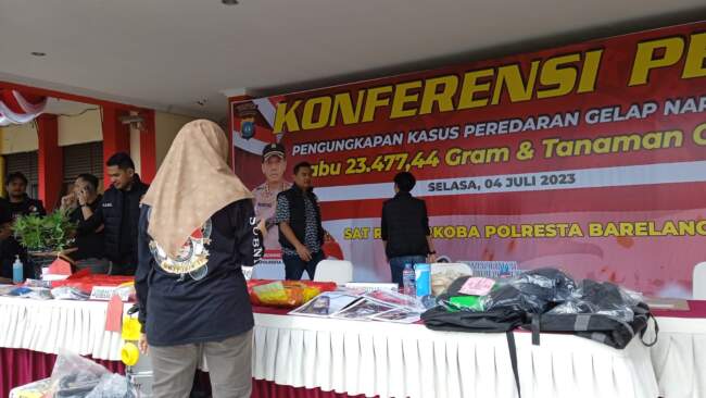 Hari ini akan kita release pengungkapan tindak pidana narkotika oleh Satresnarkoba Polresta Barelang, saya mengapresiasi Kasat Resnarkoba beserta personel Satresnarkoba Polresta Barelang dalam mengungkap tindak pidana narkotika sebanyak 9 kasus selama 1 bulan , dari tanggal 31 mei sampai dengan 26 juni 2023. Dengan tersangka sebanyak 14 orang, 1 di antaranya perempuan dan barang bukti Narkotika yang berhasil di sita Jenis sabu seberat 23.477,44 dan Tanaman Ganja di Pot Hidroponik. Ucap Kapolresta Barelang Kombes Pol Nugroho Tri N, SH, SIK, MH.