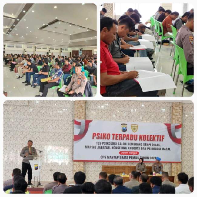 Dalam backdrop yang terpampang di dinding Aula, terlihat tes psikologi ini diperuntukkan bagi pemegang senpi dinas, Maping Jabatan, Konseling Anggota dan Psikologi Massal. Selain itu juga dalam rangka Operasi Mantab Brata Pemilu tahun 2024.