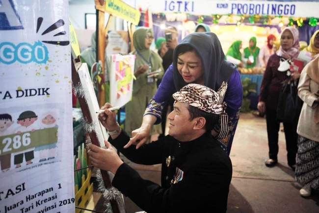 Usai berkeliling meninjau stan pameran, mereka menyerahkan piala kegiatan lomba O2SN yang digelar Dikbud. Selanjutnya, rombongan tersebut menuju area Museum Probolinggo yang masih satu komplek. Tasyakuran ditandai dengan pemotongan tumpeng serta doa bersama. (Ali)