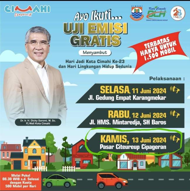 Dinas Lingkungan Hidup (DLH) Kota Cimahi kembali menggelar Uji Emisi Gratis bagi kendaraan roda empat pribadi, dinas atau angkutan barang yang tidak wajib KIR. Kegiatan ini merupakan rangakai acara peringatan hari Lingkungan Hidup Sedunia juga dalam rangka menyambut hari ulang tahun Kota Cimahi yang ke 23 yang akan diperingati pada tanggal 21 Juni mendatang.