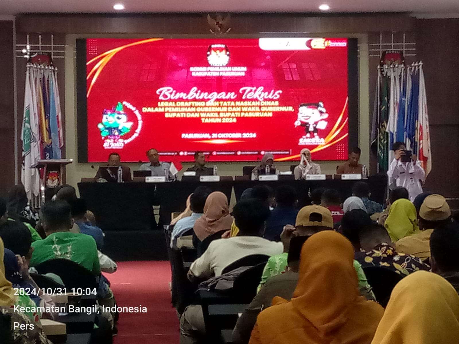 PASURUAN -Bertempat di Aula Gedung lantai dua, Komisi Pemilihan Umum (KPU) Kabupaten Pasuruan gelar acara bimbingan teknis (Bimtek) Legal Drafting dan tata naskah dinas dalam pemilihan Gubernur dan wakil gubernur, Bupati dan wakil Bupati Pasuruan tahun 2024, Kamis pagi (31/10/24).