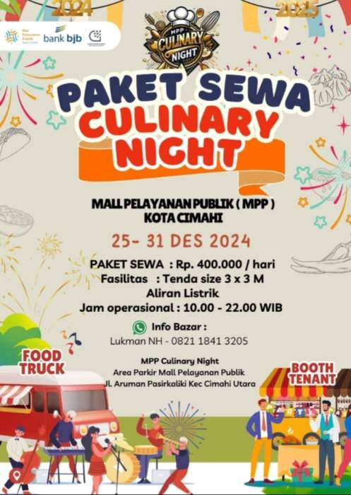 Hari Natal merupakan hari yang dirayakan oleh Umat Kristiani seluruh Dunia dan merupakan momentum liburan yang cukup panjang,Momentum libur an dimanfaatkan oleh beberapa yang jeli menangkap peluang.Culinary Night merupakan jawaban bagi sebagian besar masyarakat yang ingin sedikit melepas penat sambil mencicipi kuliner beragam yang dijual.Bertempat di pelataran Mal Pelayanan Publik(MPP) Kota Cimahi,Jalan Aruman Cibabat Kecamatan Cimahi Utara.