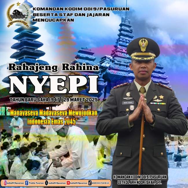 Letkol Arh Noor Iskak, S.T. Beserta Staf dan Jajaran Kodim 0819/Pasuruan mengucapkan Rahajeng Rahina Suci Nyepi Tahun Baru Saka 1947. Semoga, melalui Catur Brata Penyepian bisa menjadi momen introspeksi diri dan kesucian jiwa serta meningkatkan Sradha Bhakti kepada Ida Sang Hyang Widhi Wasa untuk mewujudkan Era Baru yang Aman, Unggul dan Madani.Sabtu, (29/03/2025)