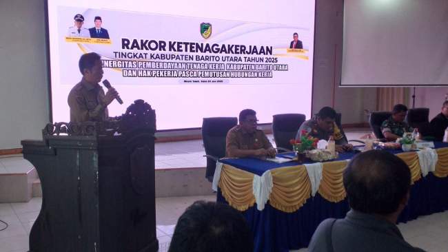 BARITO UTARA- Dinas Tenaga Kerja, Transmigrasi, Koperasi dan UKM (Disnakertranskop UKM) Kabupaten Barito Utara, melaksanakan Rapat Koordinasi (Rakor) Ketenagakerjaan Tingkat Kabupaten tahun 2025 bertempat di Aula Bapperida Barito Utara, Senin (23/6/2025).