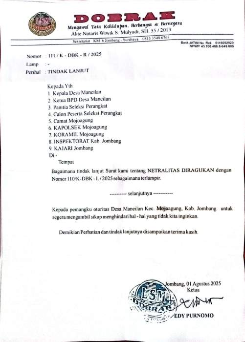 LSM DOBRAK mengeluarkan 2 somasi ke Desa Mancilan dalam rangka seleksi perangkat desa jabatan Kasie Kesra dengan Nomor surat 110/K-DBK-R/2025 dan surat Nomor 111/K-DBK-R/2025 dengan inti dari surat bahwa Meragukan Netralitas Seleksi dan Jabatan sudah ada plotnya. Awak media gempurnews mencoba untuk meminta klarifikasi dari panitia pada hari Rabu 27 Agustus 2025 di ruang kantor Kepala Desa Mancilan, ada juga di sana ketua panitia sekaligus Sekdes dan sekretaris panitia sekaligus kasi Pemerintahan.