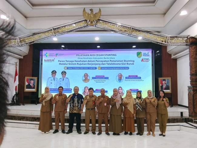 BARITO UTARA- Sekretaris Daerah (Sekda) Kabupaten Barito Utara, Drs. Muhlis melalui staf ahli bidang hukum dan politik, Drs. Ardian, M. Pd membuka dengan resmi kegiatan Pelatihan Aksi Cegah Stunting, yang bertemakan “Peran Tenaga Kesehatan dalam Percepatan Penurunan Stanting melalui sis5im rujukan berjenjang dan tatalaksana gizi buruk” dilaksanakan pada Gedung Balai Antang Muara Teweh, Selasa (14/10/2025).
