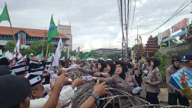 Sebagai bentuk pendekatan empati kepada massa aksi, tim negosiator dari barisan Polwan juga membagikan air minum kepada peserta aksi.