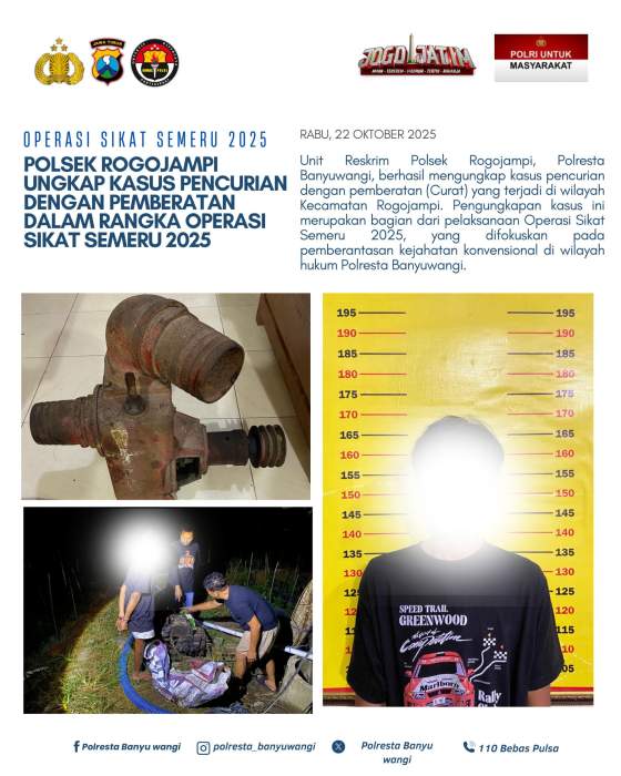 Banyuwangi, – Unit Reskrim Polsek Rogojampi, Polresta Banyuwangi, berhasil mengungkap kasus pencurian dengan pemberatan (Curat) yang terjadi di wilayah Kecamatan Rogojampi. Pengungkapan kasus ini merupakan bagian dari pelaksanaan Operasi Sikat Semeru 2025, yang difokuskan pada pemberantasan kejahatan konvensional di wilayah hukum Polresta Banyuwangi, Rabu (22/10/2025).