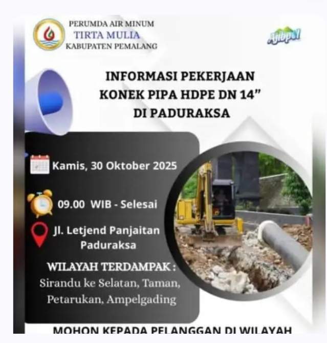 Gempurnews | Pemalang – Adanya informasi untuk semua masyarakat Pemalang dan lebih khususnya bagi semua pelanggan Perusahaan Daerah Air Minum (PDAM) Tirta Mulia Kabupaten Pemalang, pada tanggal 30 Oktober 2025 yang dijadwalkan akan ada pekerjaan perbaikan Pipa HDPF 14 Inc di jalan DI.Panjaitan Kelurahan Paduraksa Kecamatan pemalang tepatnya dekat pasar Paduraksa pada sekitar Pukul 09.00 WIB.
