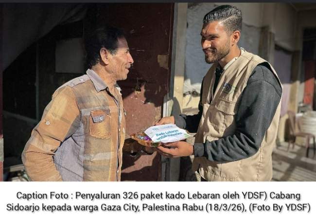 Sidoarjo | Gwmpurnews – Bentuk Kepedulian dan Kemanusiaan Yayasan Dana Sosial Al Falah (YDSF) Cabang Sidoarjo kembali salurkan paket lebaran terhadap masyarakat Palestina, sebanyak 326 paket bantuan disalurkan kepada warga di Gaza City pada 18 Maret 2026. Kegiatan Bantuan ini diharapkan dapat membantu masyarakat Palestina merasakan kebahagiaan di momen Hari Raya Idul Fitri, meskipun dalam kondisi yang penuh keterbatasan.