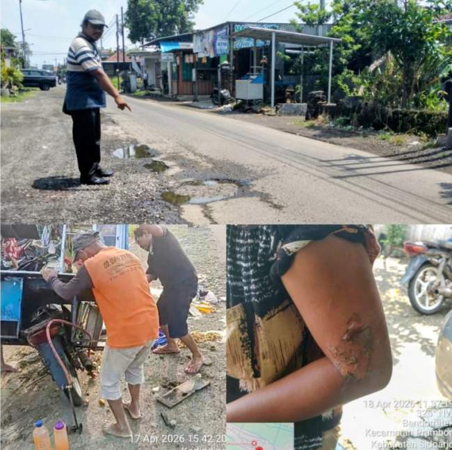 Sidoarjo | Gempurnews – Akibat lambatnya Pemerintah Daerah Sidoarjo Respon memperbaiki infrastruktur jalan yang berlubang, kali ini seorang pedagang Mie ayam bakso keliling menjadi korban di Jalan Kedinding RT 01, Kecamatan Tarik, Kabupaten Sidoarjo, menghindari jalan berlubang dan gerobak motornya terguling pada Jumat (17/4/2026). Alhasil Korban mengalami luka bakar serius