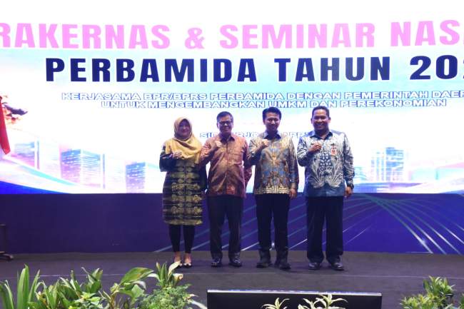 Rakernas Perbamida 2026 tersebut Plh. Sekda Sidoarjo Ainur Rahman, Ketua Umum DPP Perbamida Sofia Nurkrisnajati Atmaja serta Kabiro Perekonomian Setdaprov Jatim Aftabuddin Rijaluzzaman dan perwakilan OJK.